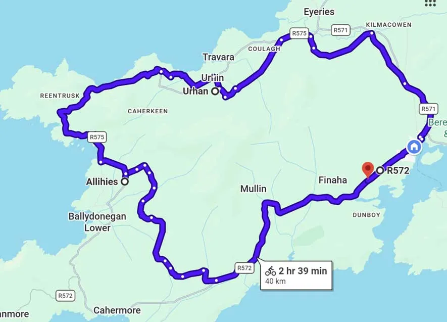 The 40km traces the full loop around the western end of the peninsula, and it punches well above its distance. You'll roll out of Castletownbere heading west on the R572, climb gently through Cahermore, and drop down into Allihies, the old copper-mining village where the houses are painted in colours you'll remember long after the cycle.